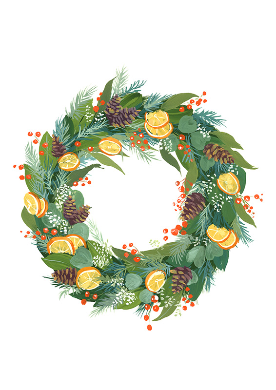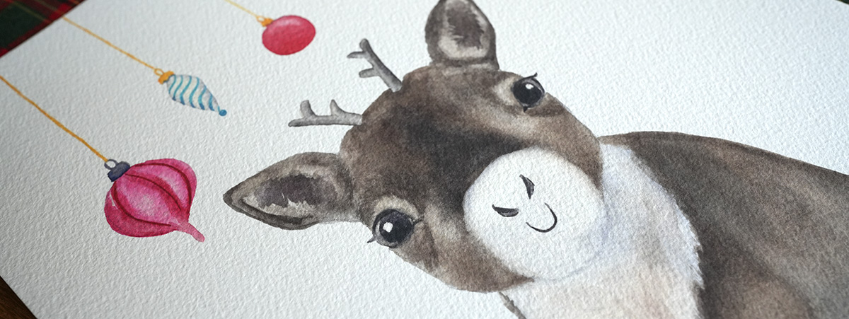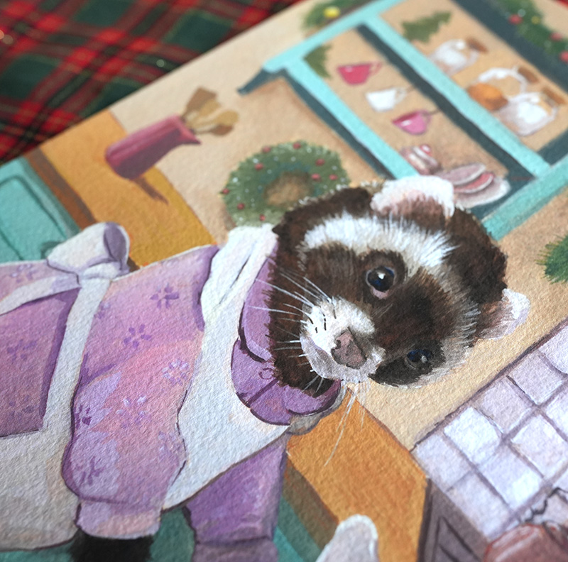 Je dois l’avouer, j’avais sous-estimé le temps nécessaire pour peindre une illustration complète, présentant un sujet et son environnement. Je ne voulais pas me presser au risque de ne pas soigner aussi bien chaque création. C’est pourquoi j’ai décidé, plutôt que de faire 6 illustrations complètes, d’en remplacer deux par des peintures plus simples, mais tout aussi colorées et festives.
