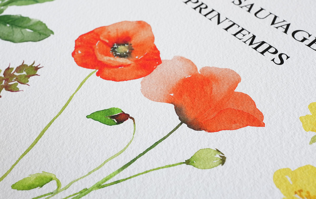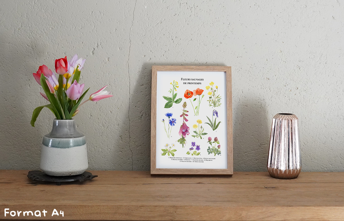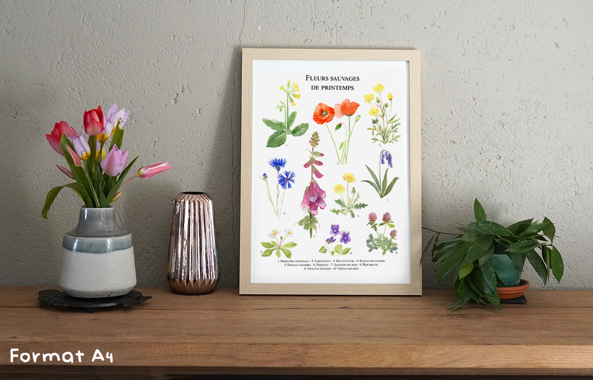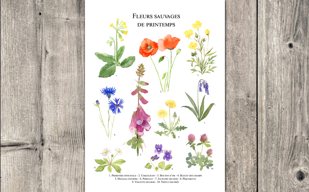 Planche naturaliste tirée de mes aquarelles. Retrouvez 10 variétés de fleurs sauvages typiques du printemps.