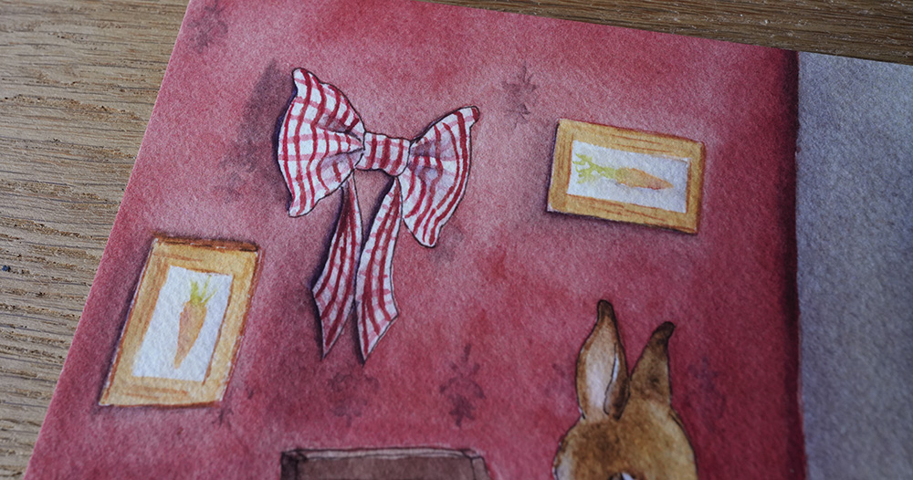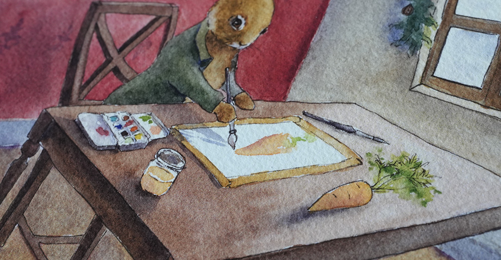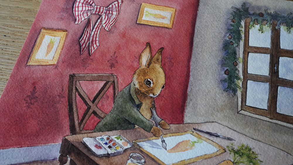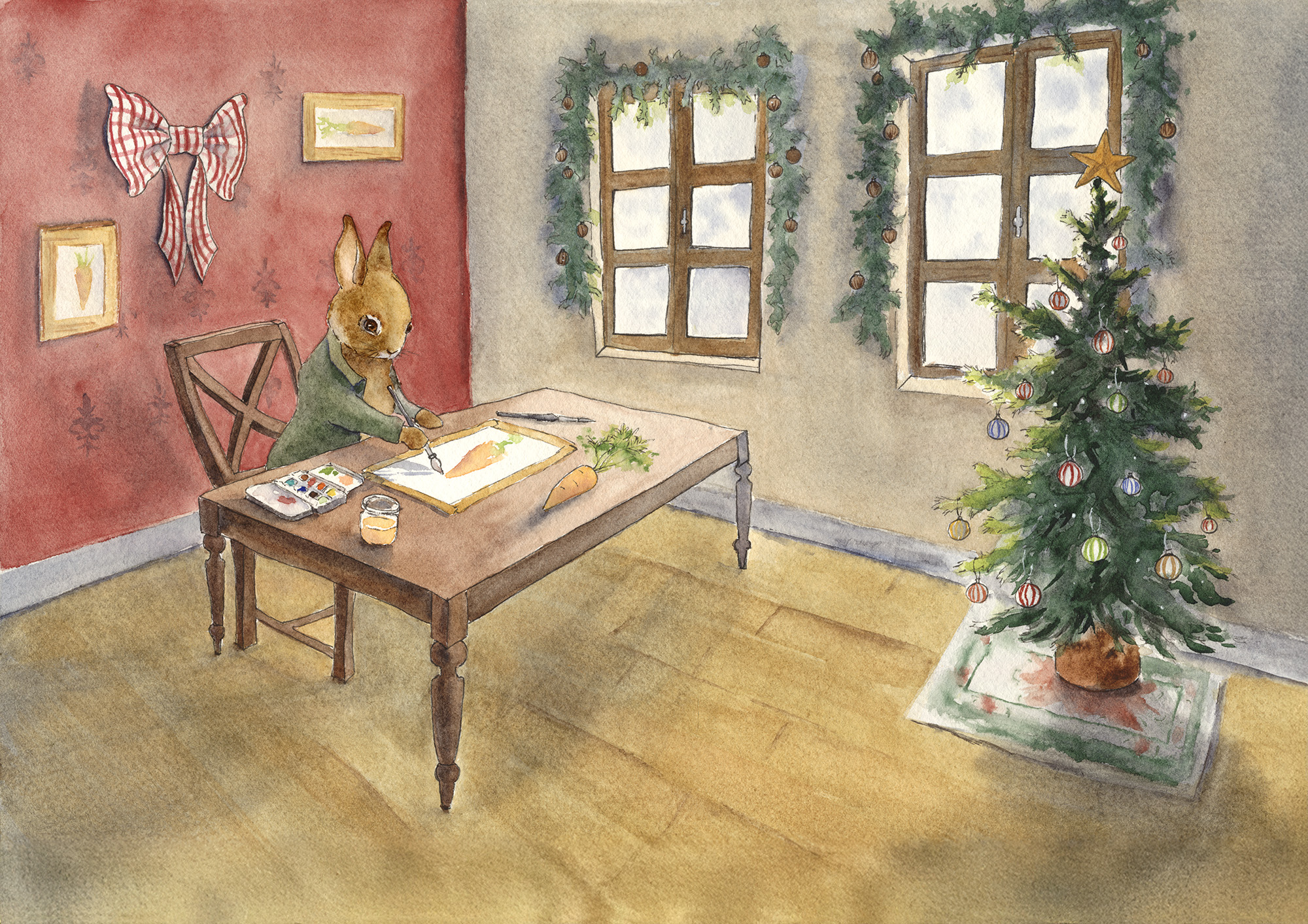 « La nature morte » est une illustration tendre et feutrée dans laquelle on peut voir un lapin peindre une aquarelle de carotte d’après nature sur un bureau en bois. Les fenêtres sont surmontées de guirlandes, tandis qu’un sapin décoré égaye la partie droite de l’image.
