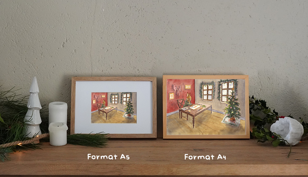 Papier : Tirage d’art sur papier texturé haut de gamme (Arches 310g/m²), fidèle à l’aquarelle originale.